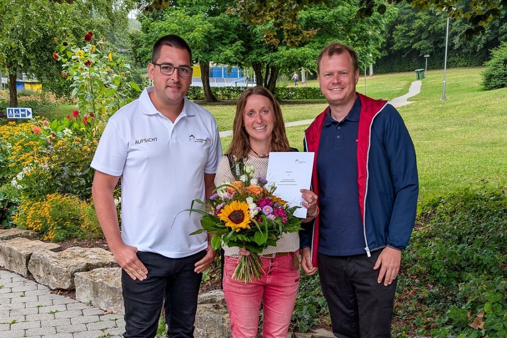 Trotz strömenden Regens ließ sich Diana Naschert den Freibadbesuch nicht nehmen – sehr zur Freude von Oberbürgermeister Michael Salomo und Betriebsleiter Dominic Kewitz, die gemeinsam einen Blumenstrauß und eine Jahreskarte für die Saison 2026 überreichten.