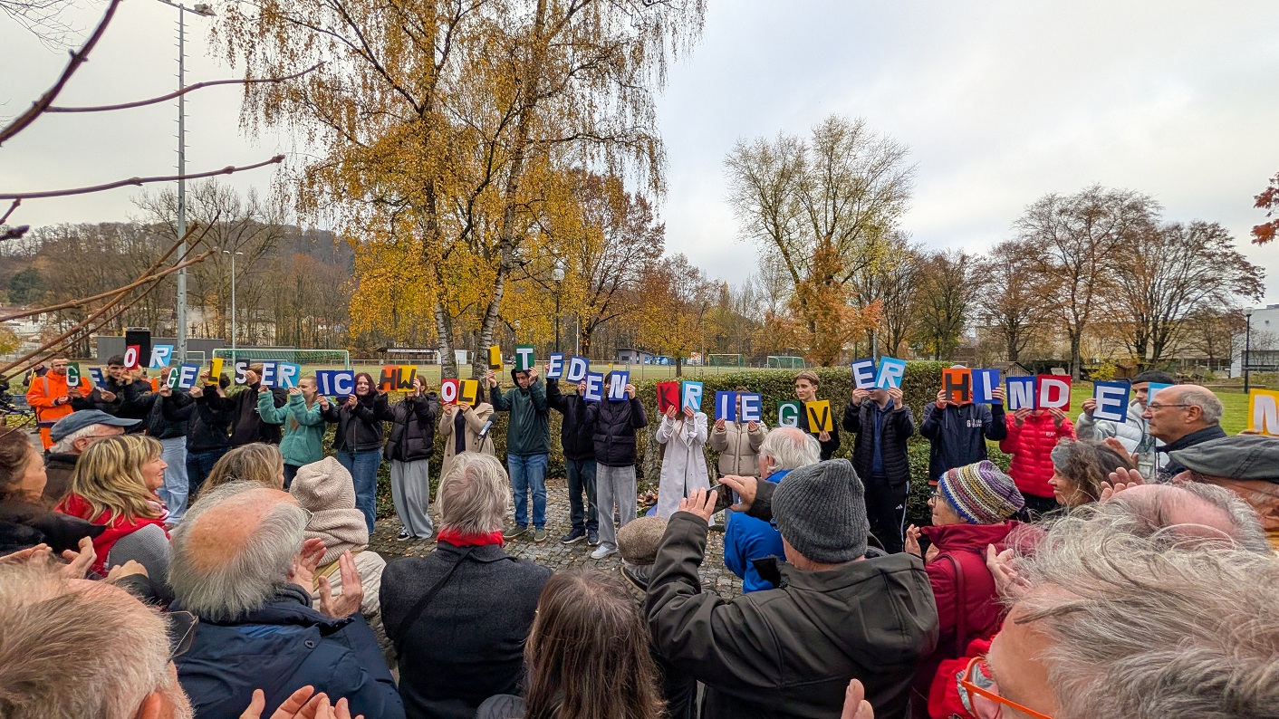 Im Anschluss gestalteten Schülerinnen und Schüler der 10. Klasse der Hirscheckschule einen besonderen Beitrag zum Gedenken. Sie hatten ein Akrostichon vorbereitet. Jedes Kind hielt dabei zwei Buchstaben in der Hand, gemeinsam ergaben sie den Satz „Georg Elser. Ich wollte den Krieg verhindern“. Mit ihren kurzen und eindringlichen Botschaften zu jedem Buchstaben erinnerten die Jugendlichen an Elsers Mut sowie an die Bedeutung von Frieden, Freiheit und Verantwortung.