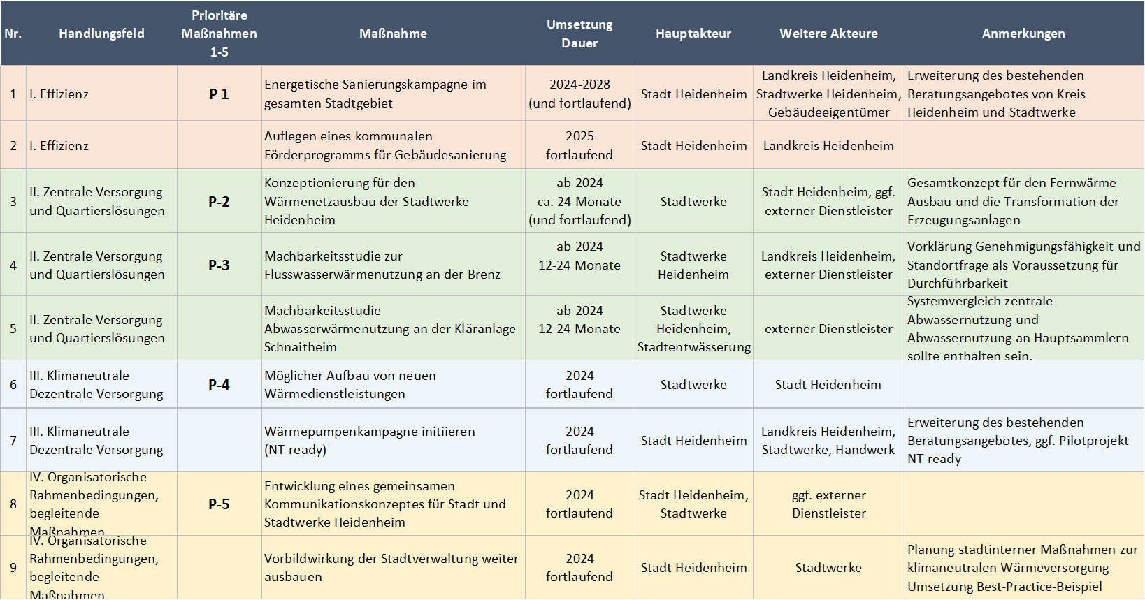 In der folgenden Tabelle sind die im Rahmen des Wärmeplans gemeinsam mit der Stadt Heidenheim und den Stadtwerken Heidenheim für eine erfolgreiche Wärmewende in Heidenheim aufgestellten Maßnahmen für die vier identifizierten Handlungsfelder mit Kennzeichnung der prioritären Maßnahmen P-1 bis P-5 zusammengestellt.