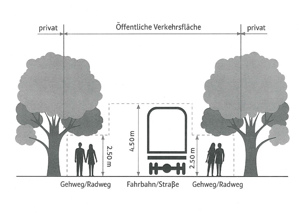 Darüber hinaus sind Gehwege bis zur Grundstücksgrenze von Bewuchs freizuhalten. Eigentümerinnen und Eigentümer sind außerdem verpflichtet, ihre Bäume regelmäßig auf Stand- und Bruchsicherheit zu prüfen und gegebenenfalls gefährdende Pflanzen oder Äste zu entfernen.