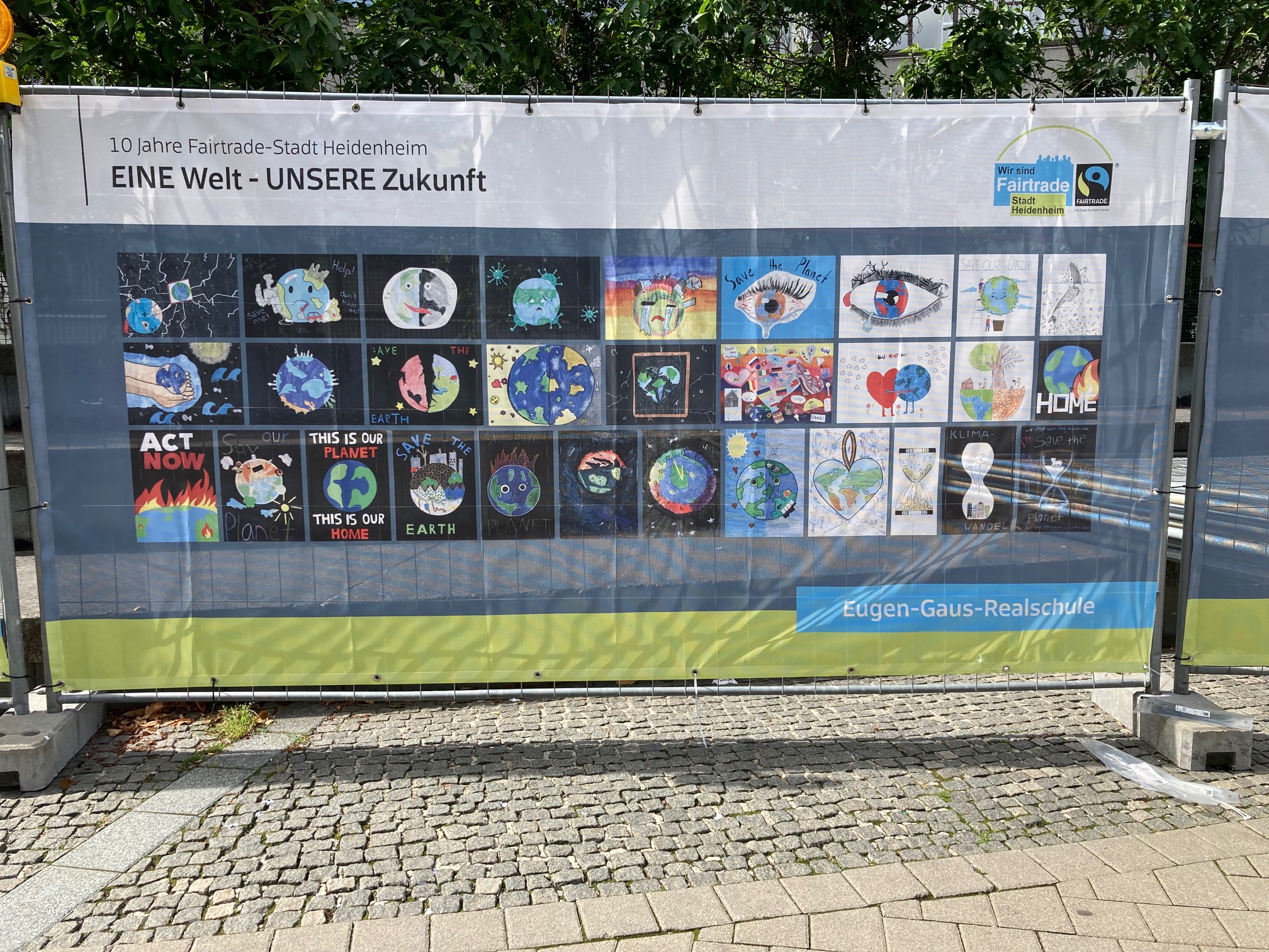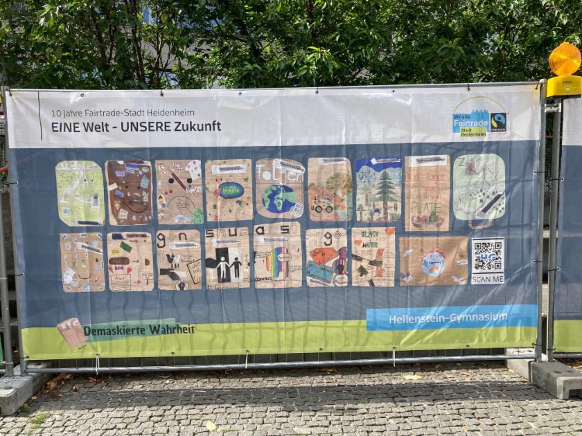Schülerinnen und Schüler gestalteten unter dem Motto "Eine Welt - Unsere Zukunft" Kunstwerke für vier Bauzäune an unserem Rathaus. Die Bauzäune wurden aufgrund der Rathaussanierung aufgestellt.
